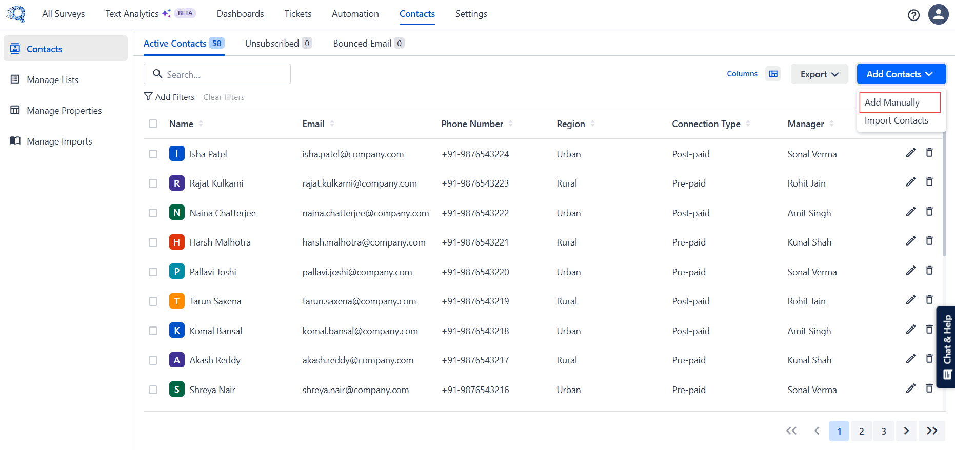 Click on Add Manually or Select Add Manually from the Add Contacts drop-down menu.