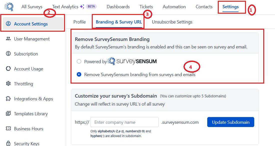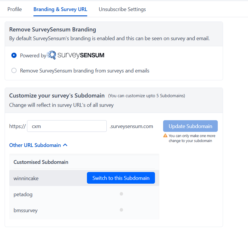 After customization, the link format becomes: https://[YourSubdomain].surveysensum.com/[SurveyCode]