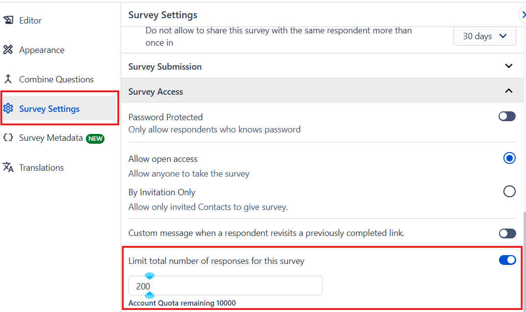 - Set the limit on Response collection through Anonymous link and Close the survey.