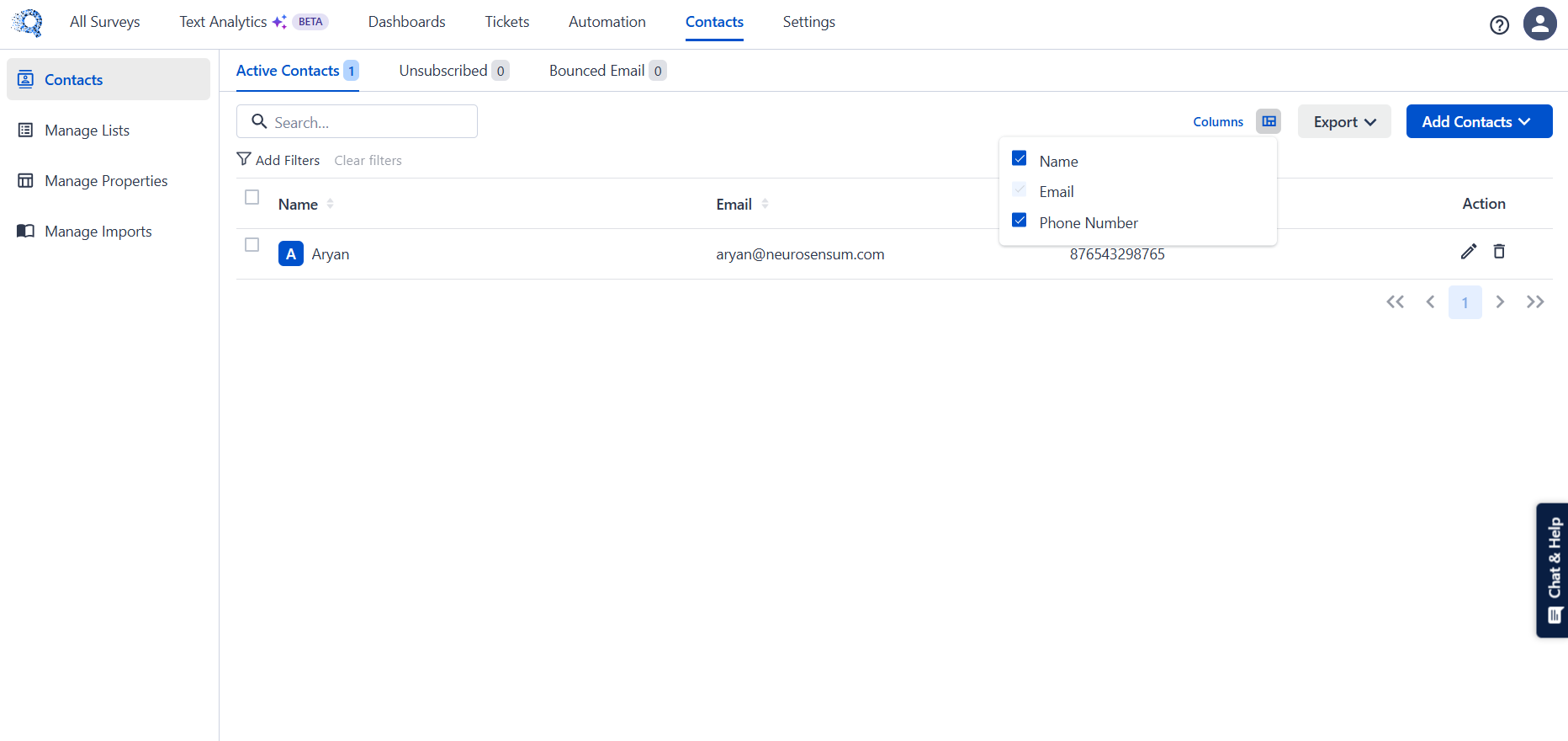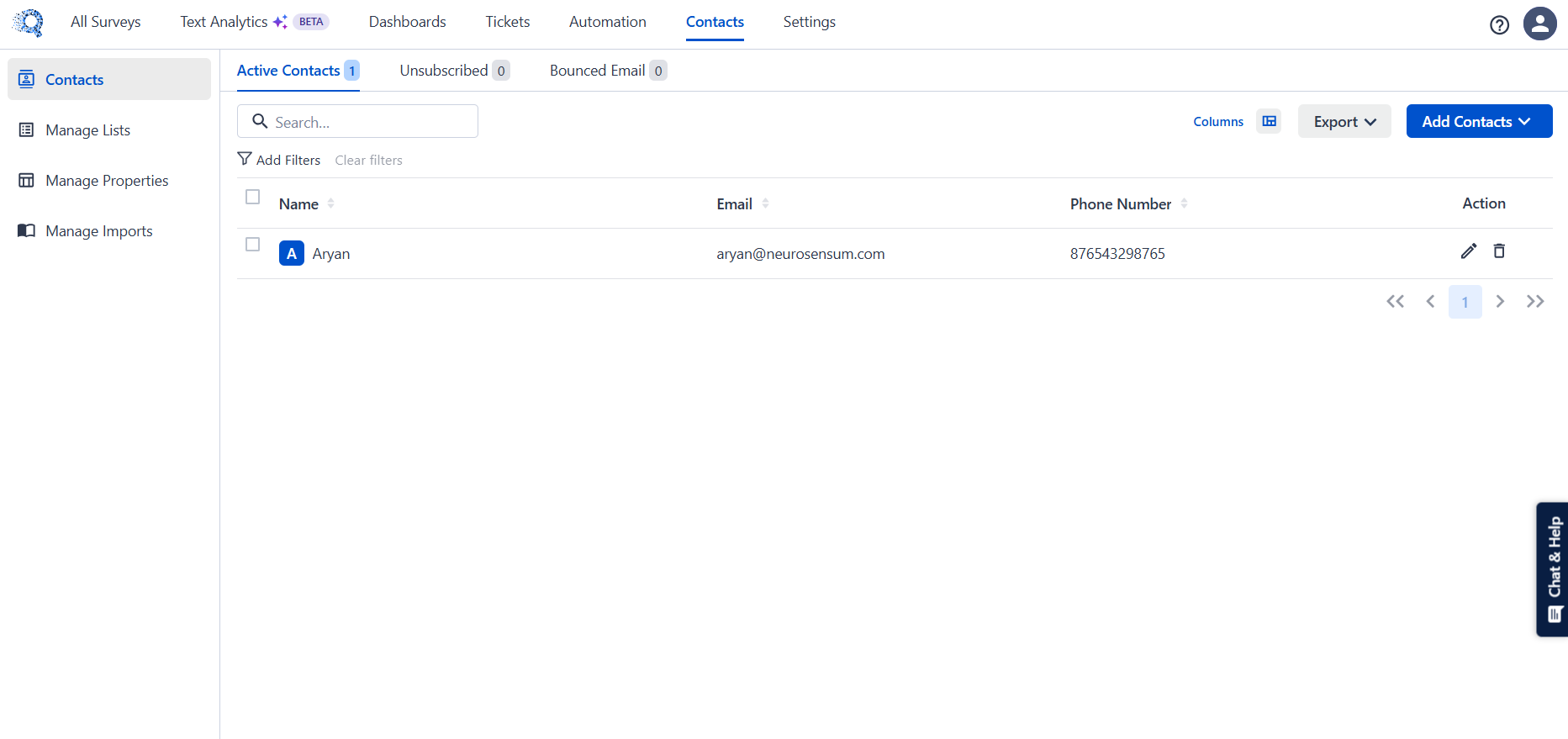 The Contacts tab helps you manage all your customer contact details in one place. From here, you can view, filter, import, export, and organize contacts into lists for better targeting and reporting.