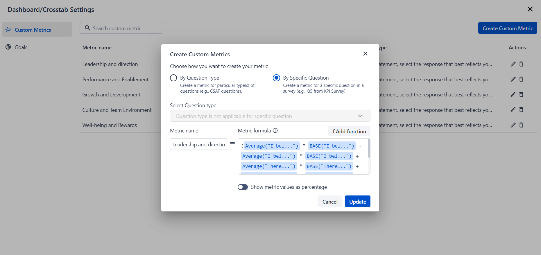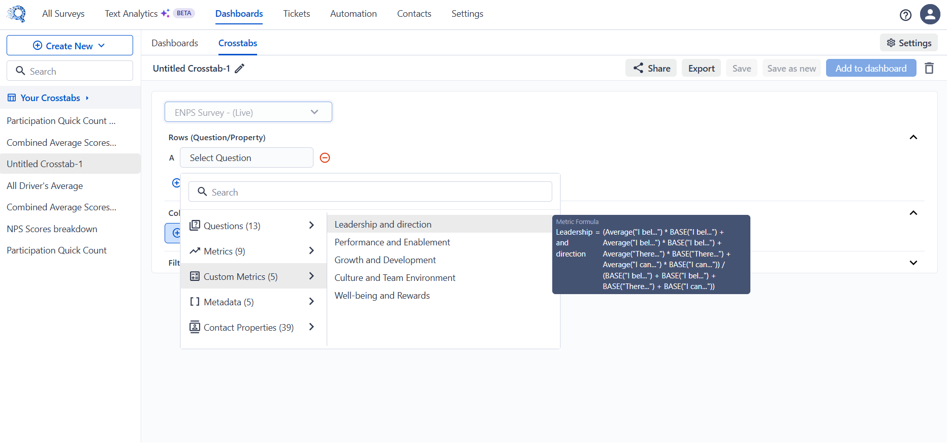 Custom Metrics let you create calculated KPIs from survey responses using formulas. These metrics can be used in Dashboards and Crosstabs to analyze data in a more meaningful way.
