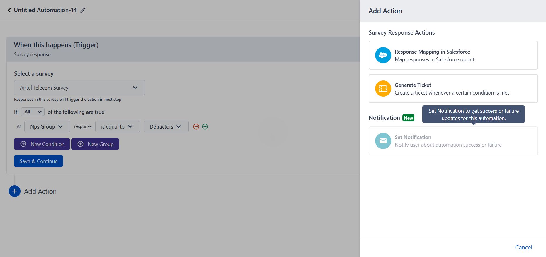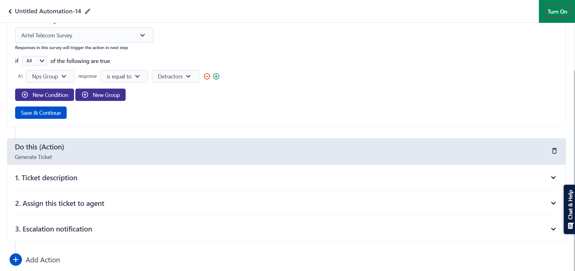 Creating tickets using Automation allows you to automatically generate support tickets whenever specific survey responses meet defined conditions. This ensures that critical feedback is instantly routed to the right team without manual intervention.