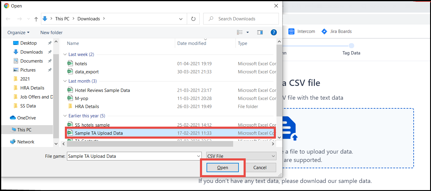 Once you choose the TA project, you have to upload the CSV file in the next step. You have to just click on the Upload icon and a file selection popup will appear.