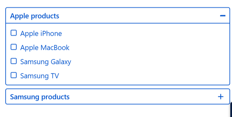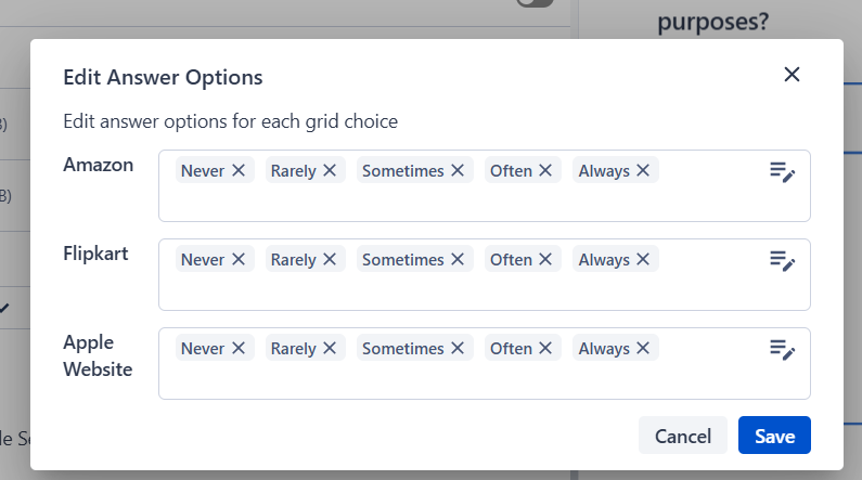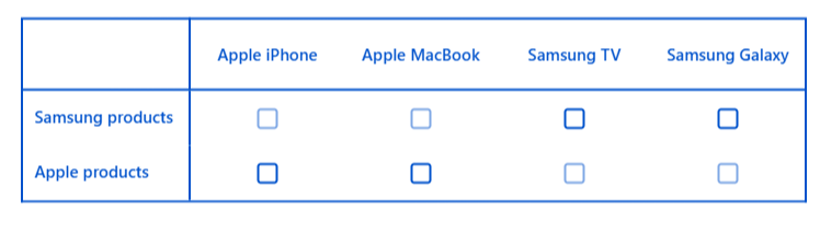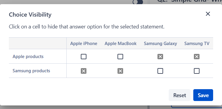 Example: If your rows are 'Apple products' and 'Samsung products', and your columns are 'Apple iPhone', 'Apple MacBook', 'Samsung Galaxy', and 'Samsung TV', you can hide Samsung Galaxy and Samsung TV from the Apple products row — so respondents only see relevant options.