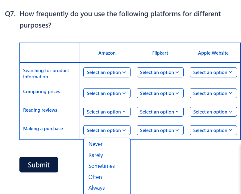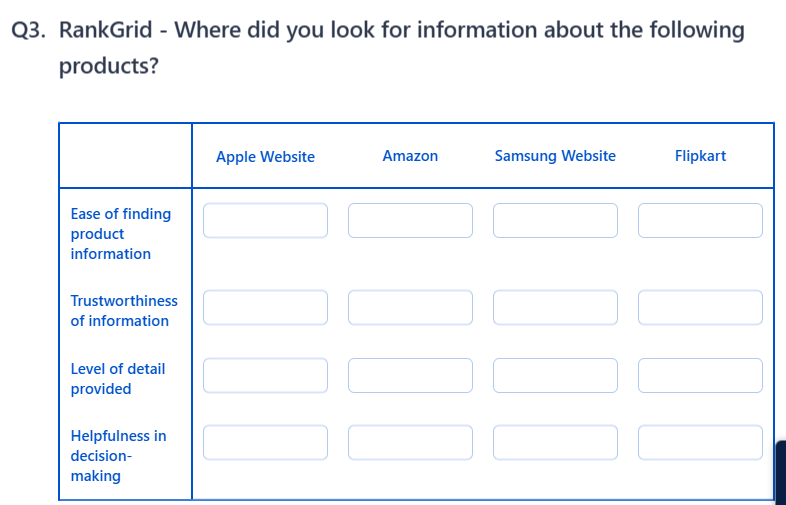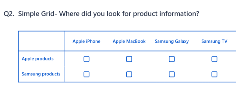 When to use it: You want clean, structured selections — for example, "Where did you look for product information?" with rows for Apple products and Samsung products, and columns for different platforms.