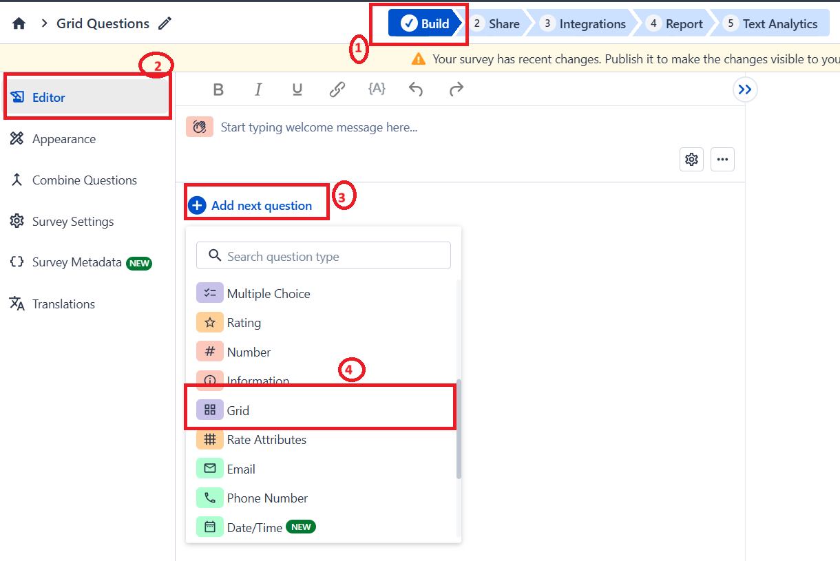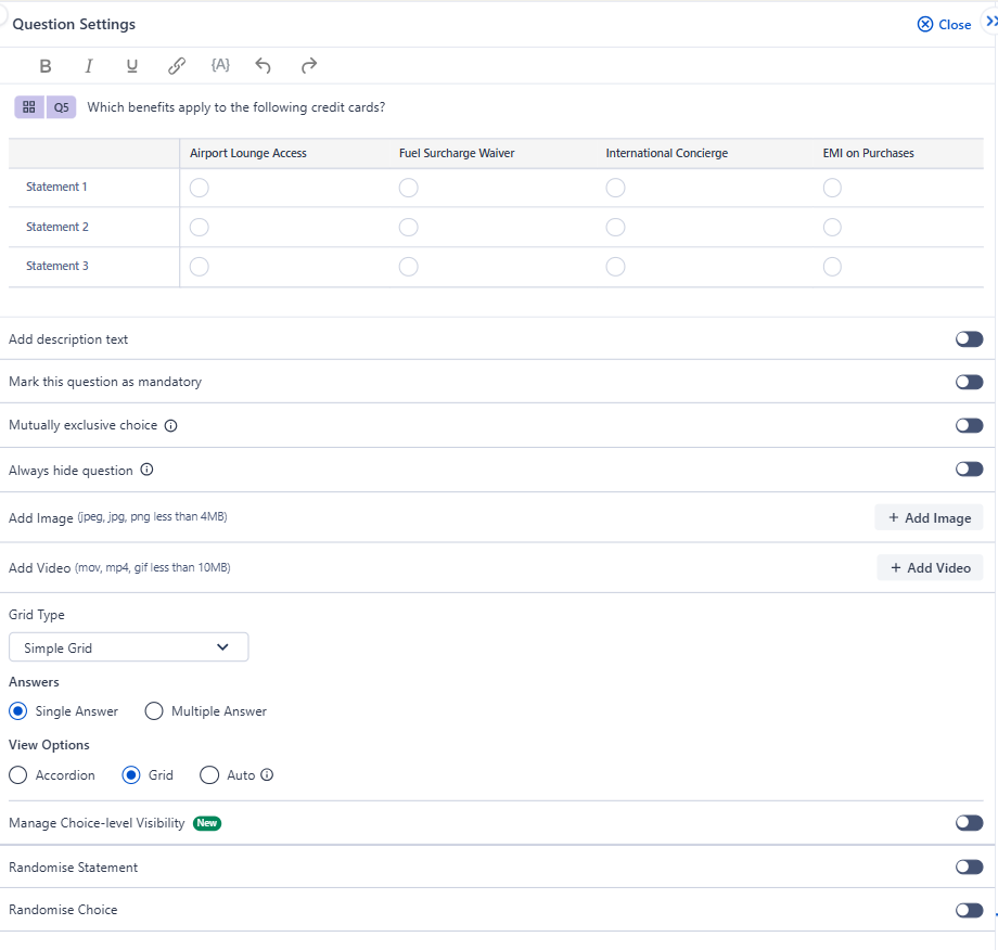 SurveySensum supports five grid types under the Matrix question. Select the type that best matches how you want respondents to answer each row.