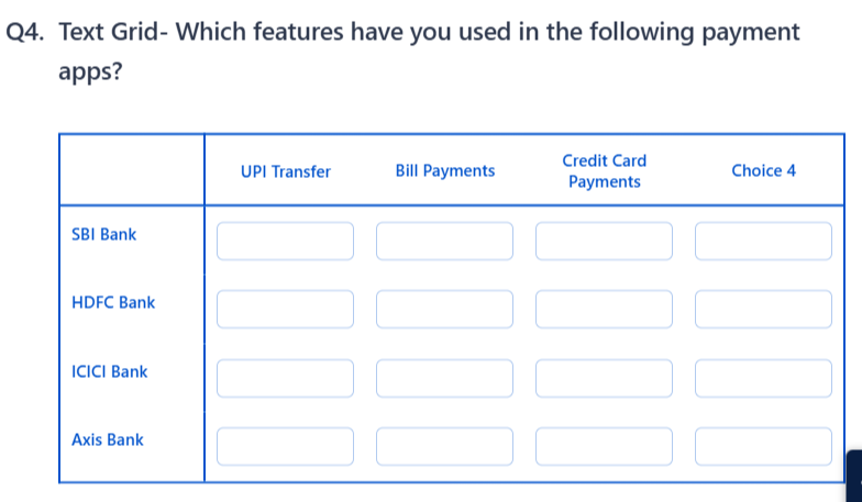 When to use it: Collecting quantities, amounts, or short open-ended answers — for example, "Which features have you used in the following payment apps?" with rows for Google Pay, PhonePe, Paytm, etc.