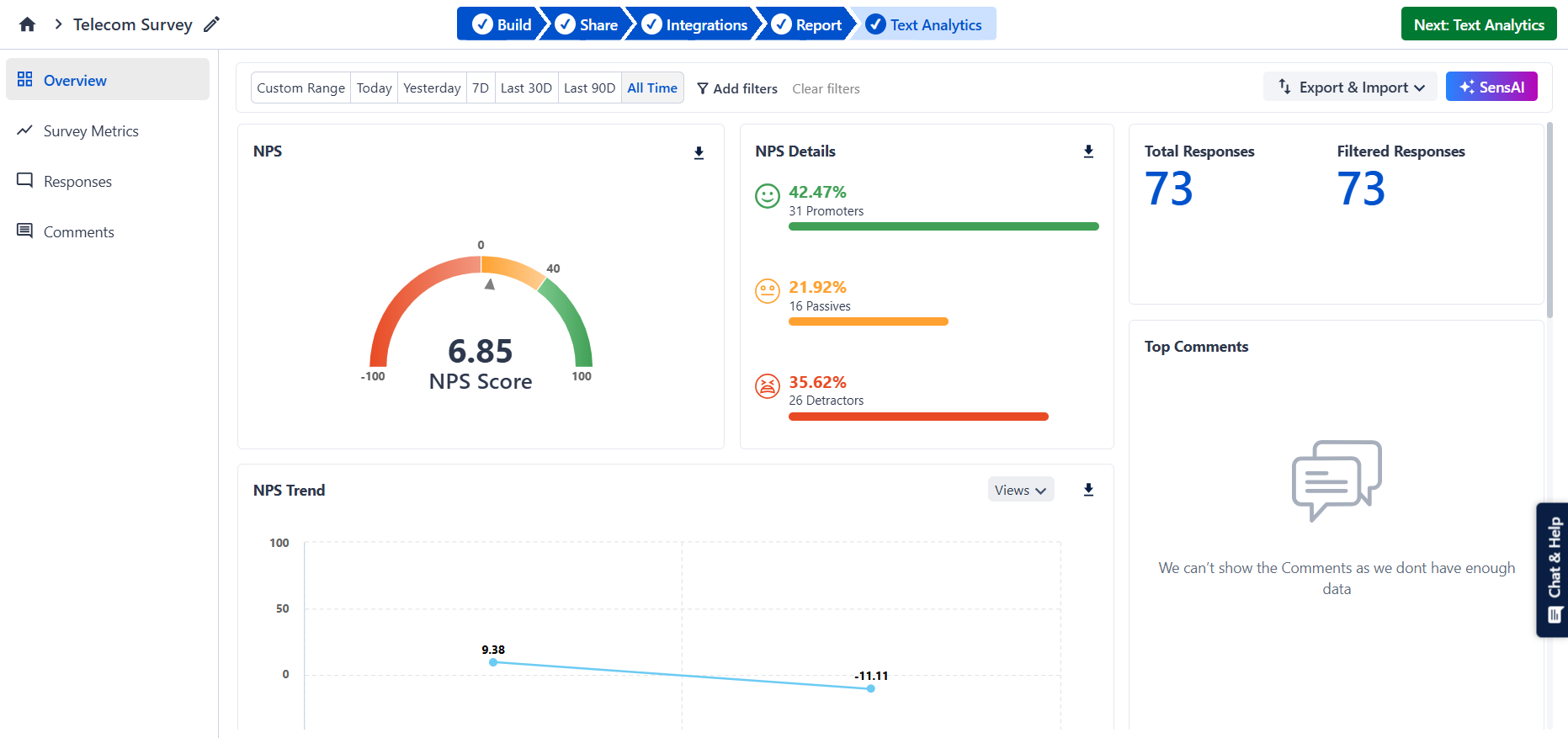 The Overview page in the Reports module provides a consolidated snapshot of your survey performance. It highlights key metrics, trends, and text analysis insights to help you quickly understand customer feedback and make informed decisions.