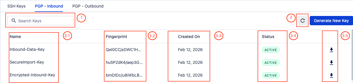 3.1 Name – Shows the name assigned to the inbound key.3.2 Fingerprint – Displays the key fingerprint (may appear as unavailable for some uploaded keys). A unique identifier for the key. You can copy it using the Click to Copy After copying it, the fingerprint can be shared with external systems, integration partners, or administrators to confirm that the correct key has been configured on both sides verification.When key is created, the system generates a very long key (hundreds of characters). Instead of comparing the entire key, systems generate a short summary of that key called a fingerprint.3.3 Created On – Indicates when the key was generated.