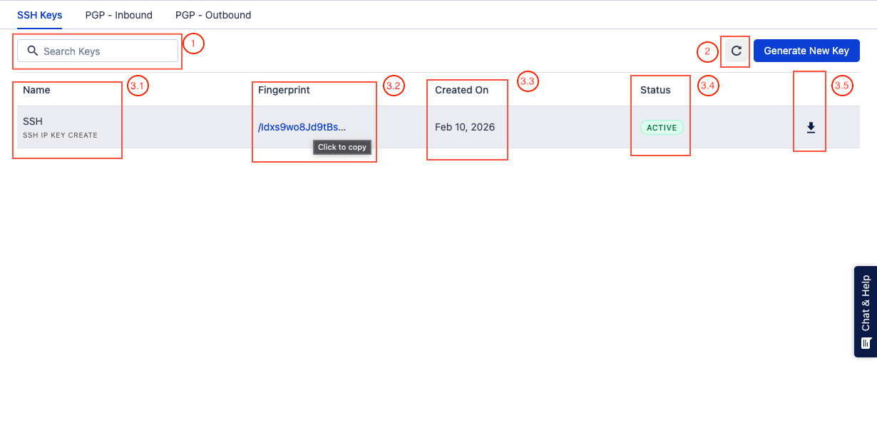 3.1 Name – Shows the name assigned to the inbound key.3.2 Fingerprint – A unique identifier for the key. You can copy it using the Click to Copy After copying it, the fingerprint can be shared with external systems, integration partners, or administrators to confirm that the correct key has been configured on both sides verification.When an Inbound key is created, the system generates a very long key (hundreds of characters). Instead of comparing the entire key, systems generate a short summary of that key called a fingerprint.3.3 Created On – Indicates when the key was generated.