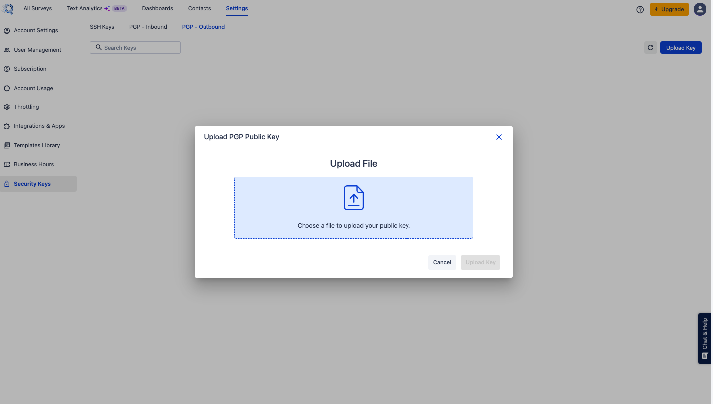 4.1 Click the upload area to select a file.4.2 Click Upload Key to add the public key to the system.4.3 The Cancel button closes the upload window without uploading the key.
