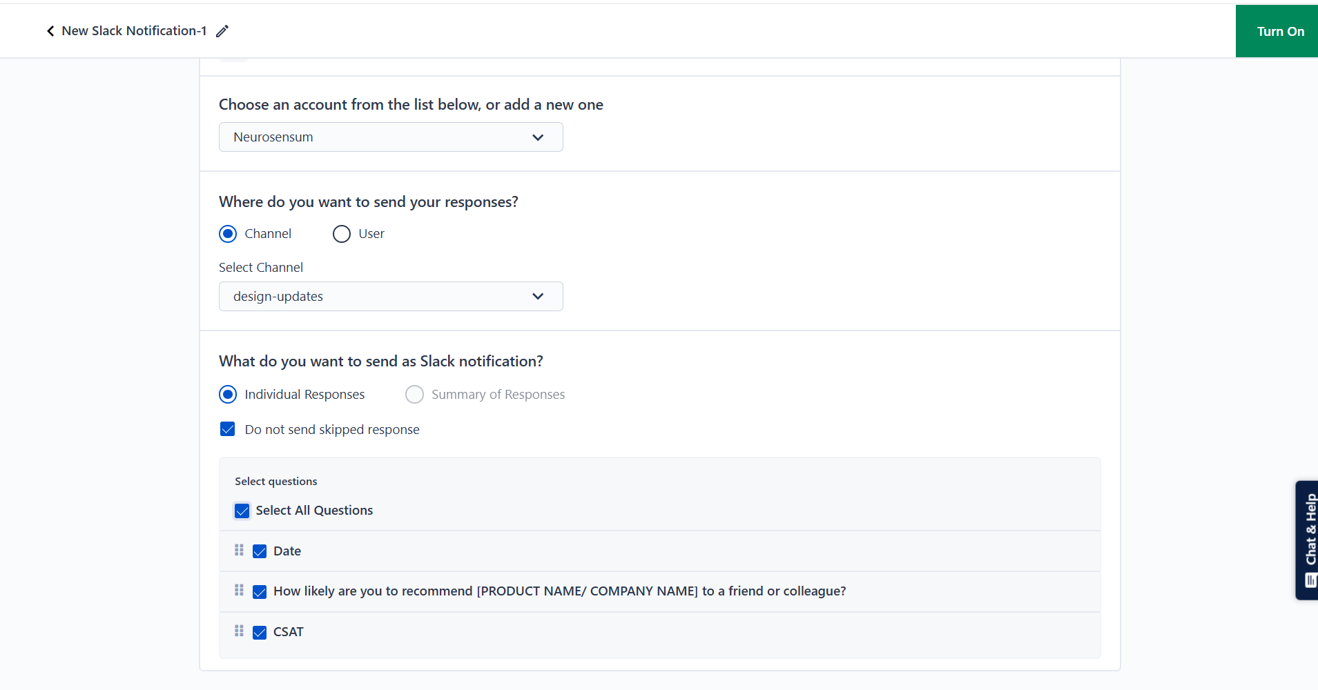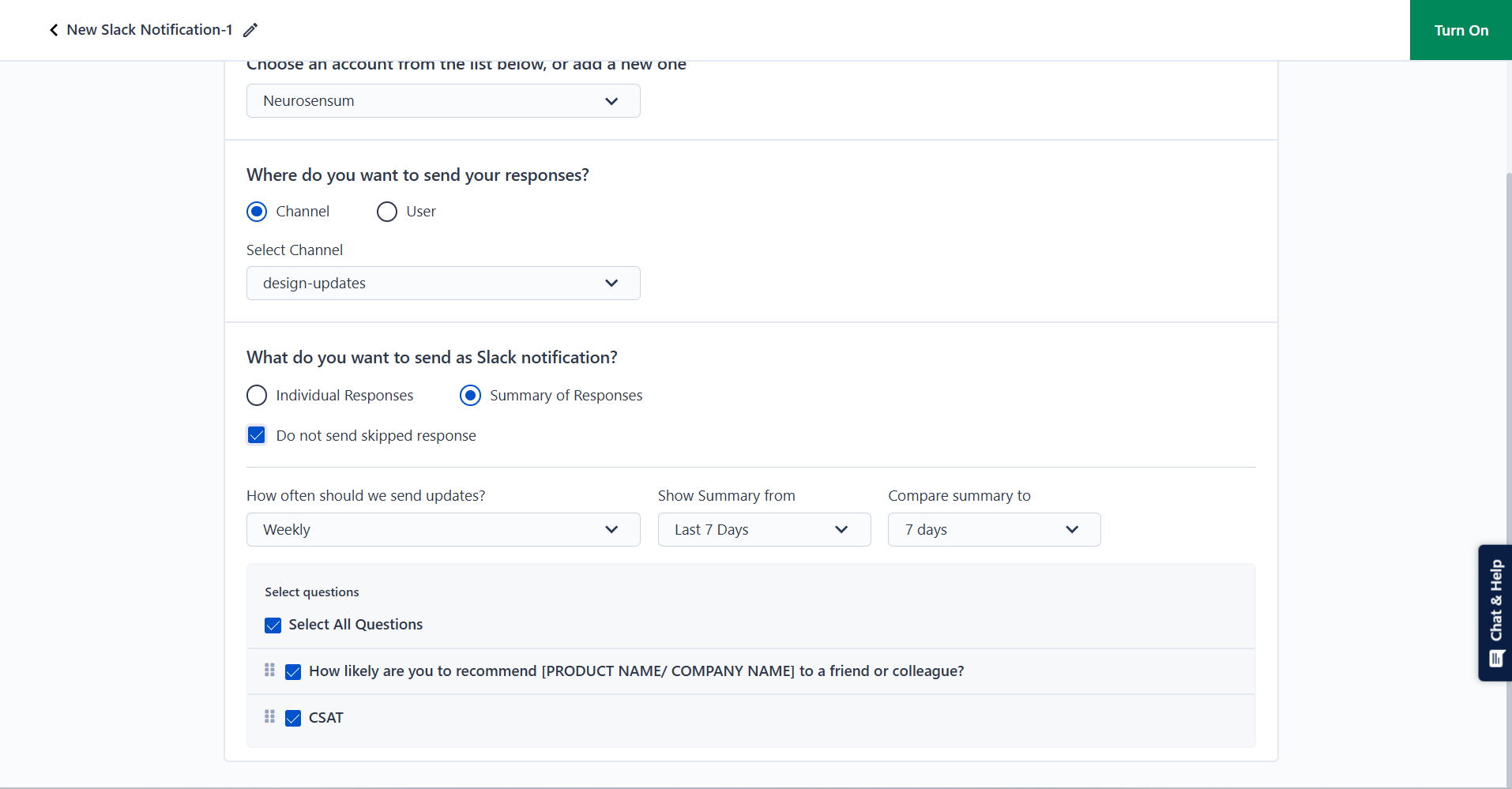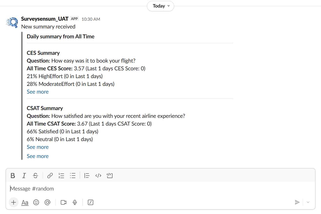 When you select "Summary of Responses" during Slack integration setup, the system sends an aggregated data summary notification to the selected Slack channel/user.
