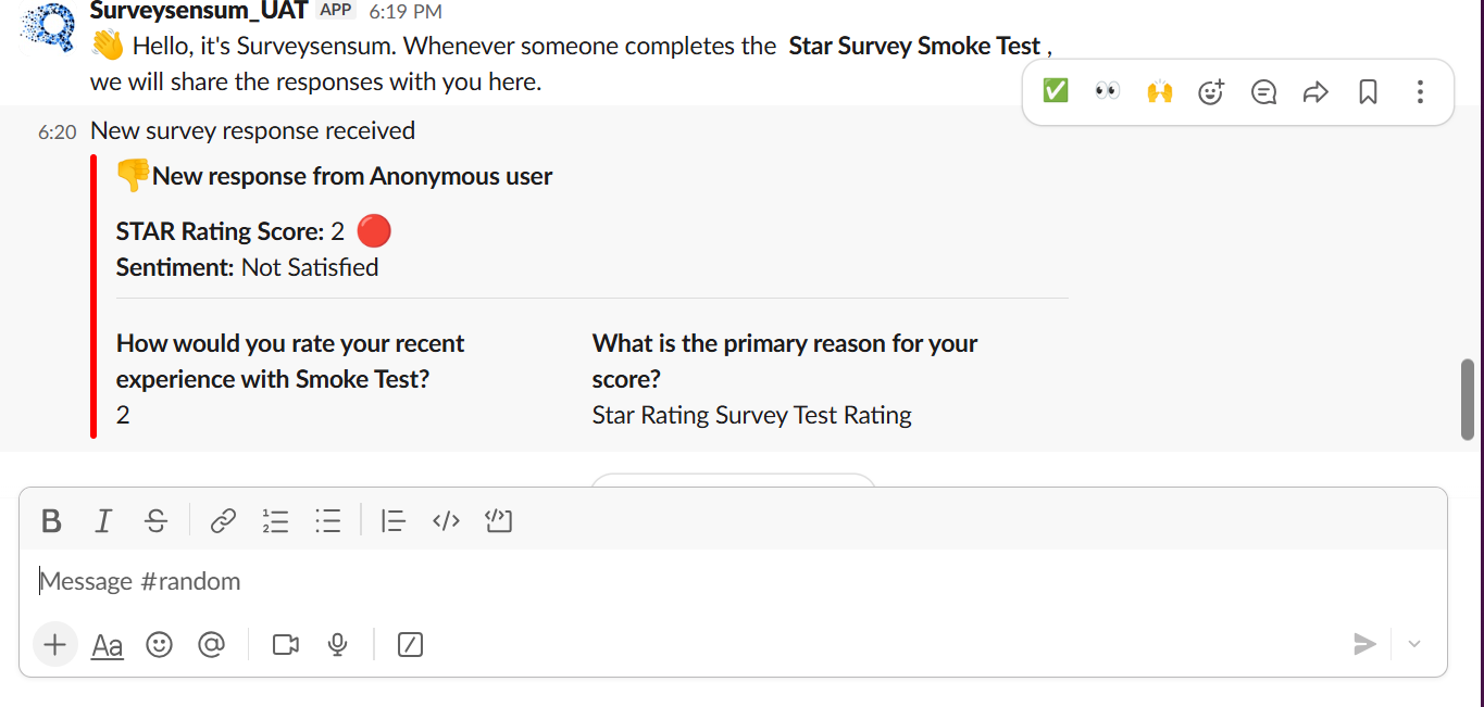 Once the automation is set up and individual response notifications are enabled, each new survey response will be shared in Slack in the following format