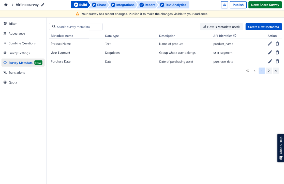 This page provides a complete overview of all metadata created for the survey.