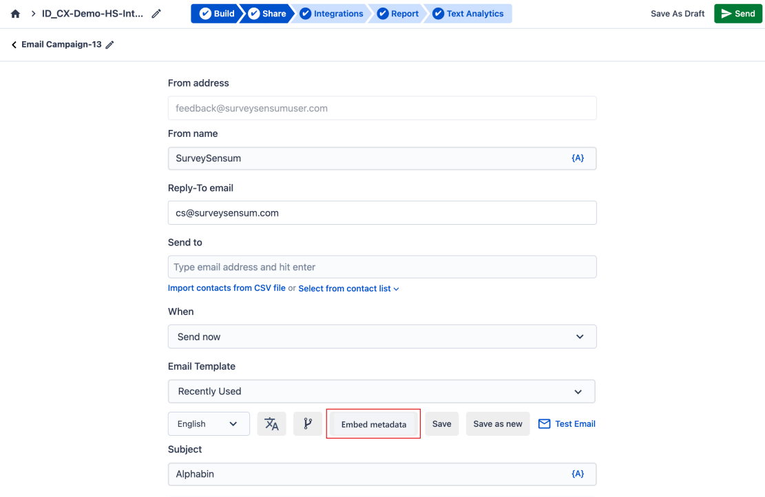 You can embed metadata while sending survey emails to automatically attach predefined values to all responses collected through that campaign.