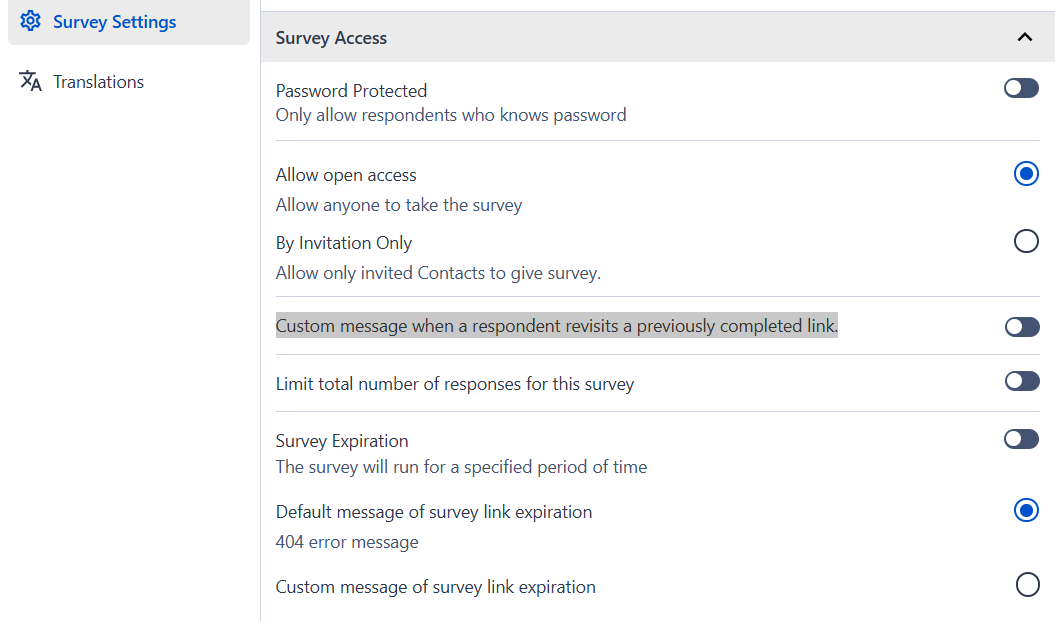Default message of survey link expiration: By default, the respondent will receive a 404 error message, when they try to respond after the survey has expired, which can be set by you using the Survey Expiration option.