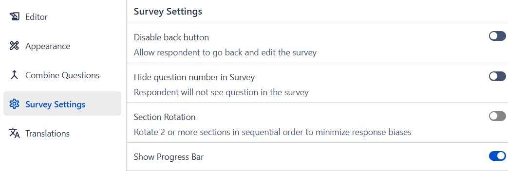 Show Progress bar: This setting displays a progress bar at the top of the survey to show respondents how much of the survey they have completed. It helps set clear expectations about survey length. Progress visibility can improve completion rates and reduce drop-offs.
