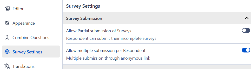 Allow multiple submission per Respondent: This toggle is moved by default, multiple responses are recorded by the anonymous link generated while sharing your survey. By changing the toggle, you will be able to record the response using that link only once.