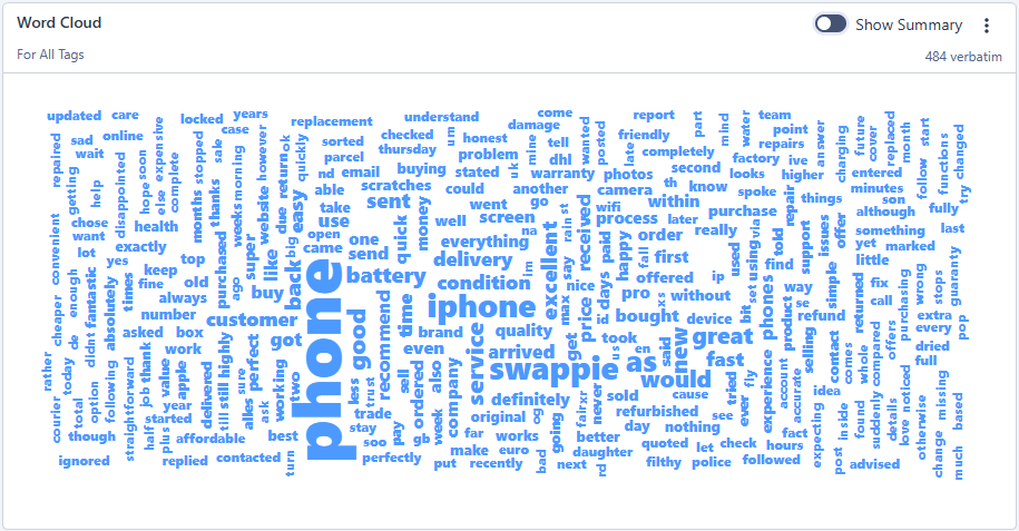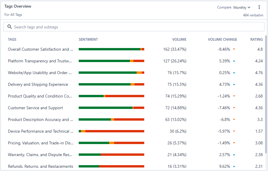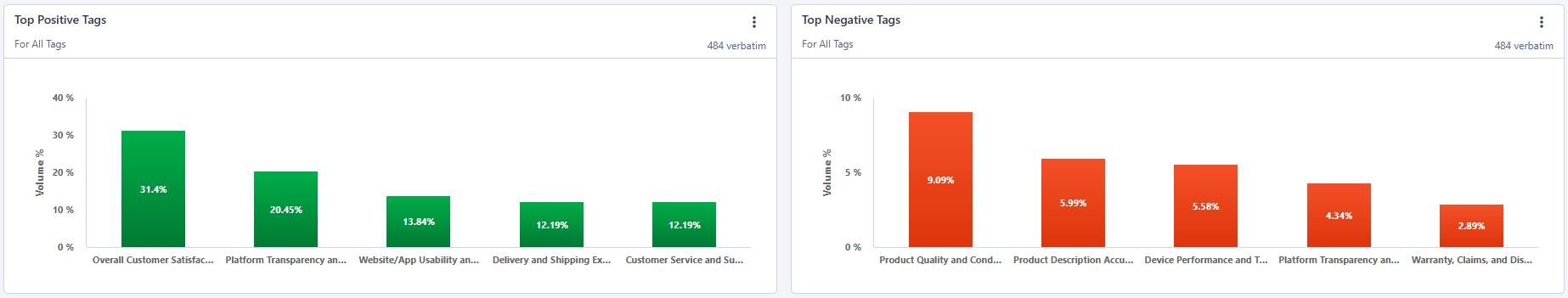 It provides a comprehensive analysis of the most commonly mentioned topics or themes (“tags”) in customer feedback. It helps you understand what customers are talking about and how they feel about those topics.