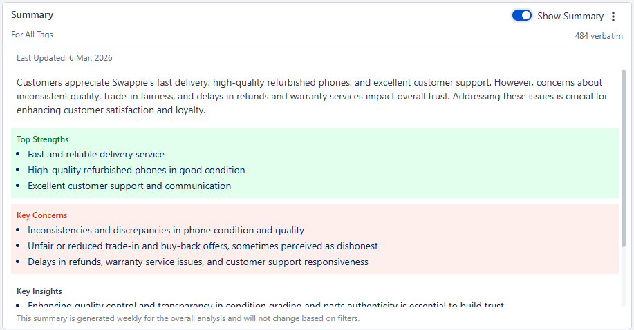 The Summary section provides an overview of the overall customer feedback based on the analyzed tags and sentiments.