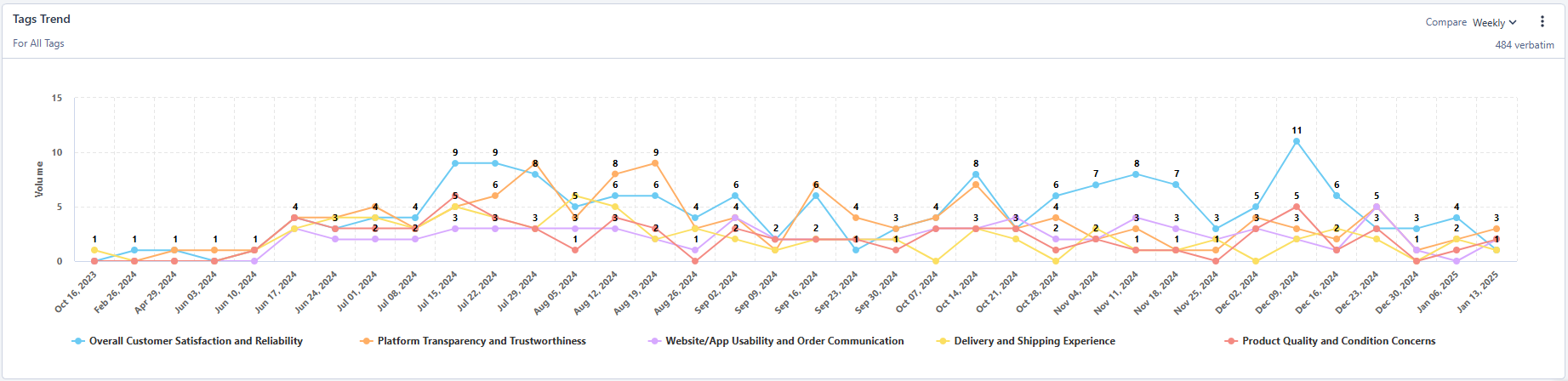 It shows the monthly trend of tag volumes, how frequently each feedback tag was mentioned over time.