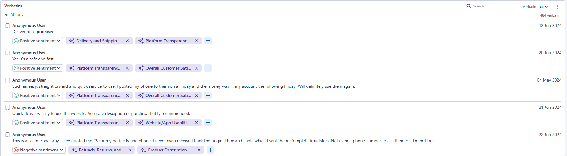 This section captures individual customer responses (verbatims) along with their star rating, the sentiment detected (Positive / Neutral / Negative), the option to tag the feedback.