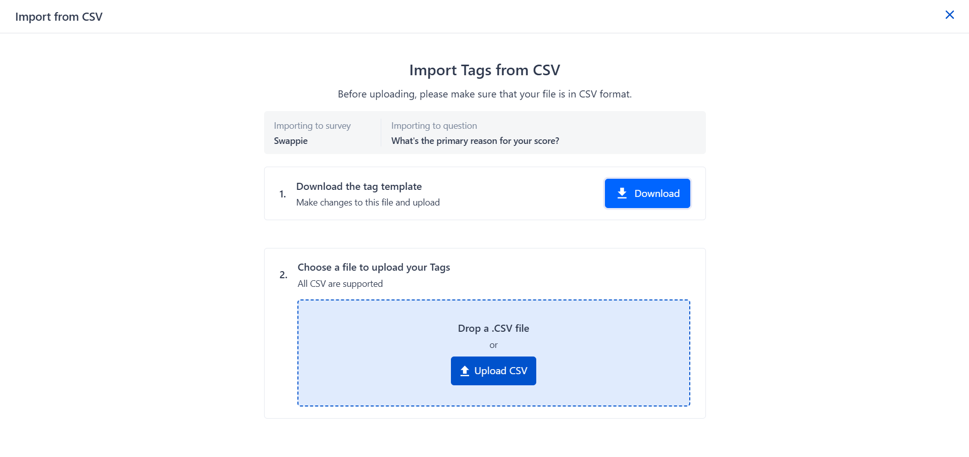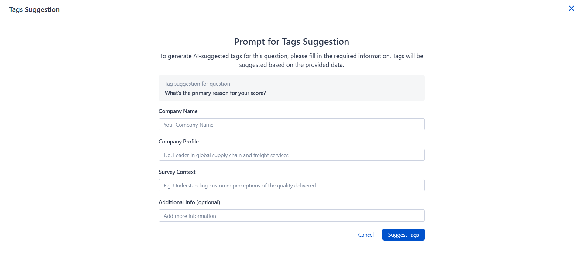 A Tag is a keyword or label used to categorize and organize open-ended responses (verbatims). Tags help group similar responses together so that you can analyze patterns and insights from customer feedback.