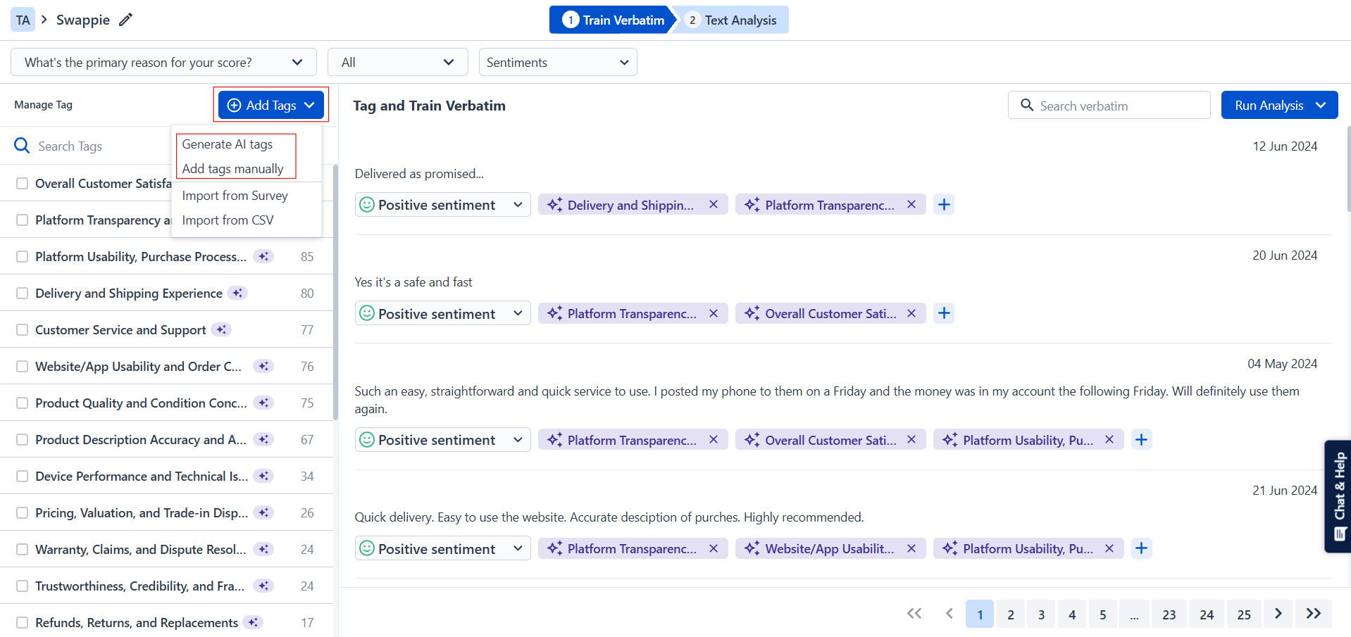 Multiple tags can be added to a single verbatim if the feedback relates to multiple topics.
