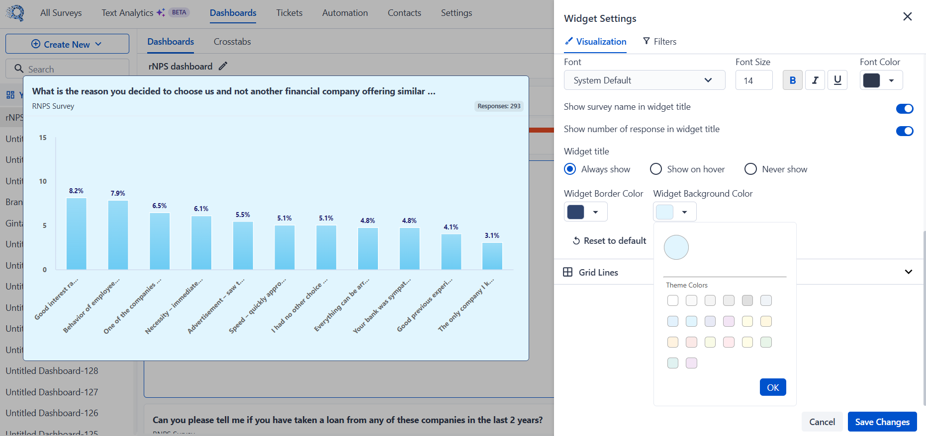 Under Widget Settings → Visualization, a list of all available response options is displayed with checkboxes.